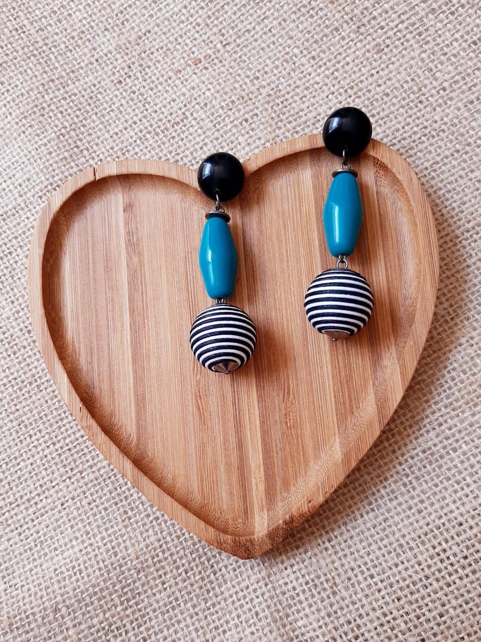 Brinco com peças de resina na cor preta e verde e bola de fio preto e azul.