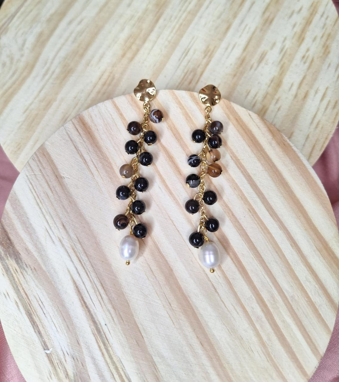 Brinco com bolinhas de pedra ágata e pérola barroca.