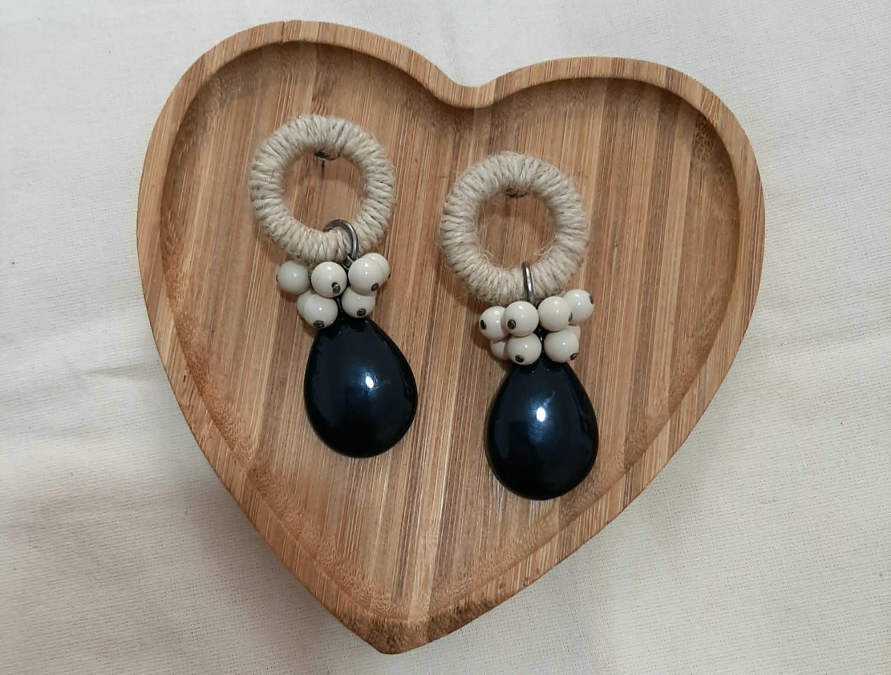 Brinco com gota de resina preta, bolinhas plásticas na cor marfim e rodela de sisal.