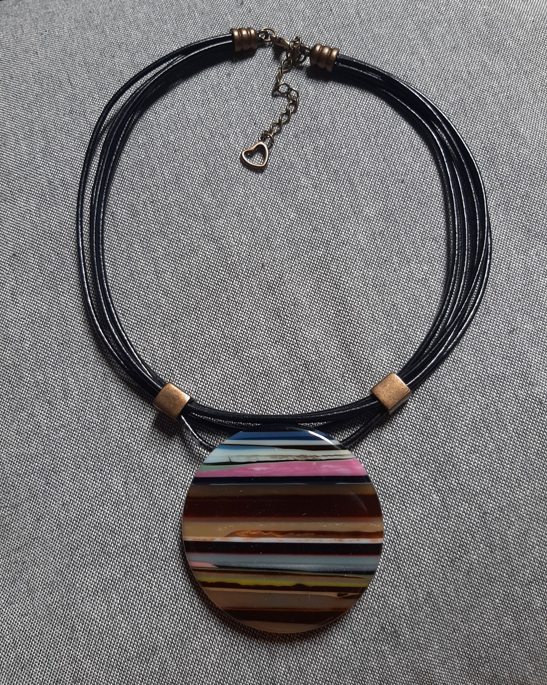 Colar com medalha de resina mesclada e fios de couro preto.